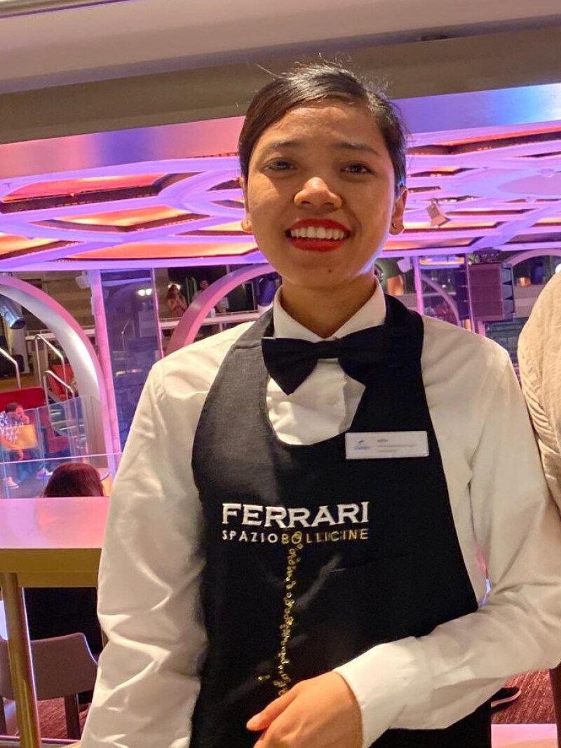 Thank you for helping me, I am looking for a person probably of Filipino nationality, met last August in one of the largest ships in the world, the Costa Smeralda for a cruise in the Mediterranean Sea. During this cruise, I had the honor and the chance to meet one of your compatriots. She is an employee of the Costa Cruise company working at the bar "Le Spazio Bollicine Ferrari", a remarkably professional and pleasant employee. I didn't talk to this wonderful young woman much so as not to disturb her during her work. During my last evening on board the ship, on the evening of August 23, 2024, I dared to ask him to take some photos for the memory of this rich encounter. I hope that person, or a member of their family or friends, will be able to recognize them.